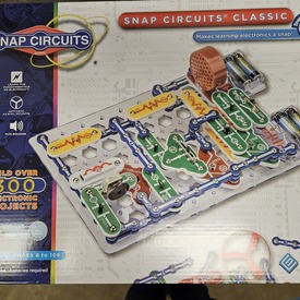 Simple electrical circuitry is explored using building pieces that snap to a curcuit board making different projects that play sound, turn on a light or motor, and other fun projects. This "classic" kit includes additional power trays, and circuitry not found in the Snap Circuit Juniors. Each one will need to be individually reserved.